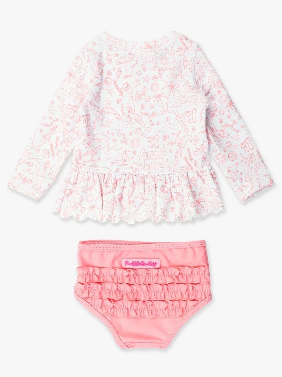 Style your favorite little girl in this Scallop Long Sleeve Rash Guard Bikini for beach day. This bottom is fully lined while the top is unlined. It's made with UPF 50+ sun protected fabric for all day comfort and fun.
